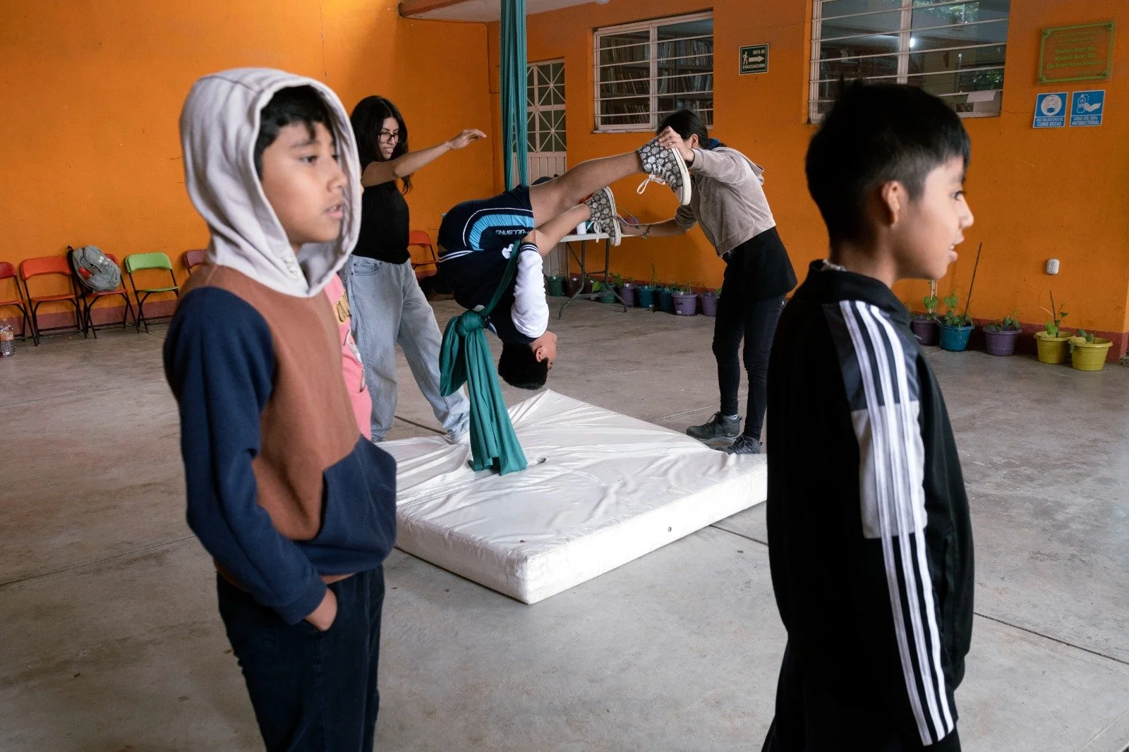 This workshop introduces children to the basics of aerial dance using fabric. Through playful exercises—such as wrapping, suspending, climbing, spinning, and sliding—they develop strength, flexibility, coordination, and confidence. The sessions encourage teamwork and body awareness in a safe and creative environment.