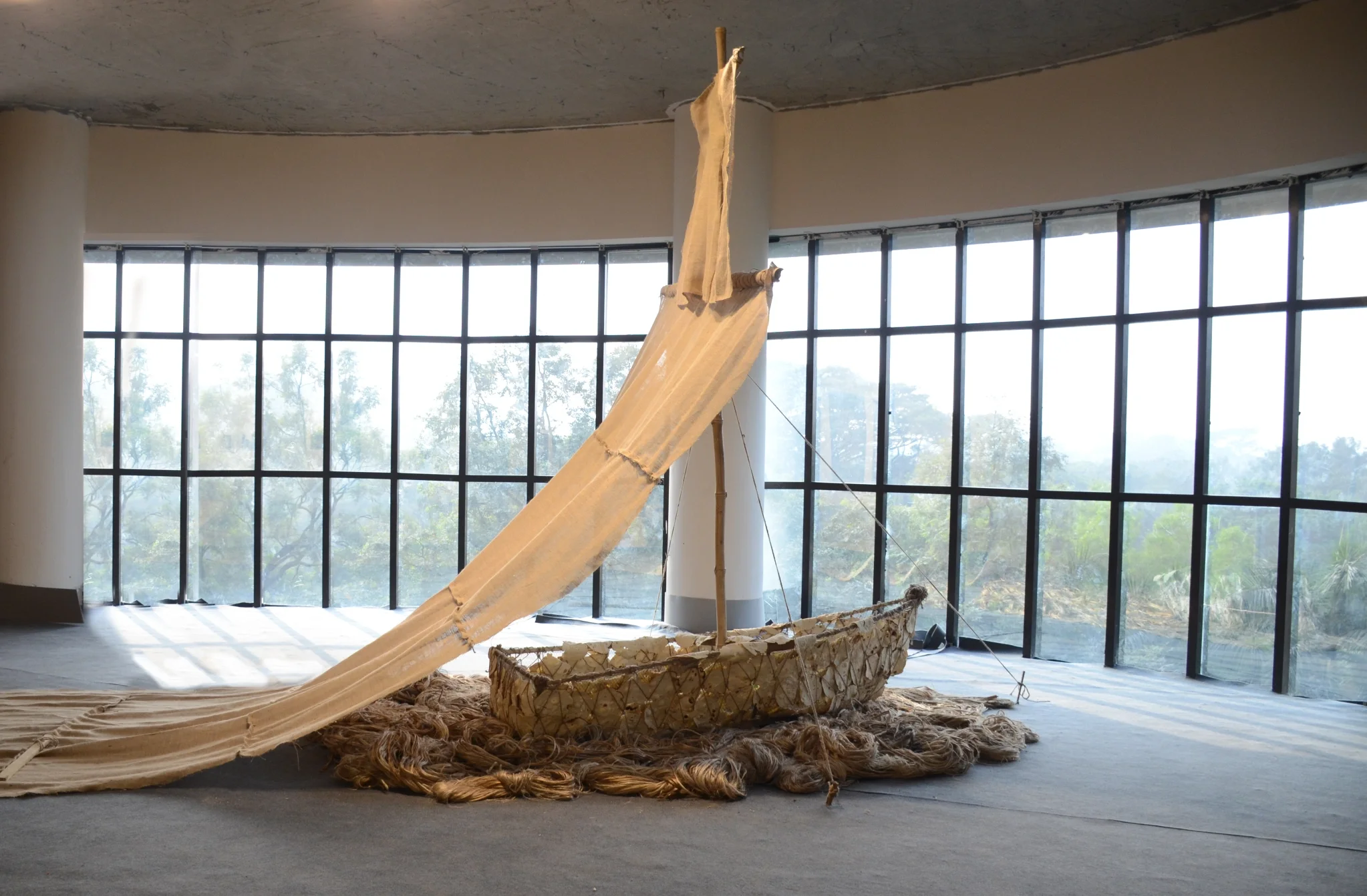 ‘On the Same Boat” is an ongoing project by Velvet Zoe Ramos. This particular iteration, The Heavy sail is built by handmade salt flat bread and found objects addresses the instability of food (bread that disintegrates in water) and access to nourishment by creating “a boat filled with dreams constrained by an expiry date once it sets sail. Lastly, the dried grass that laces the boat like a river or an ocean presents an allegory of an uprooted community, yet still strong, resilient, and regenerating.”